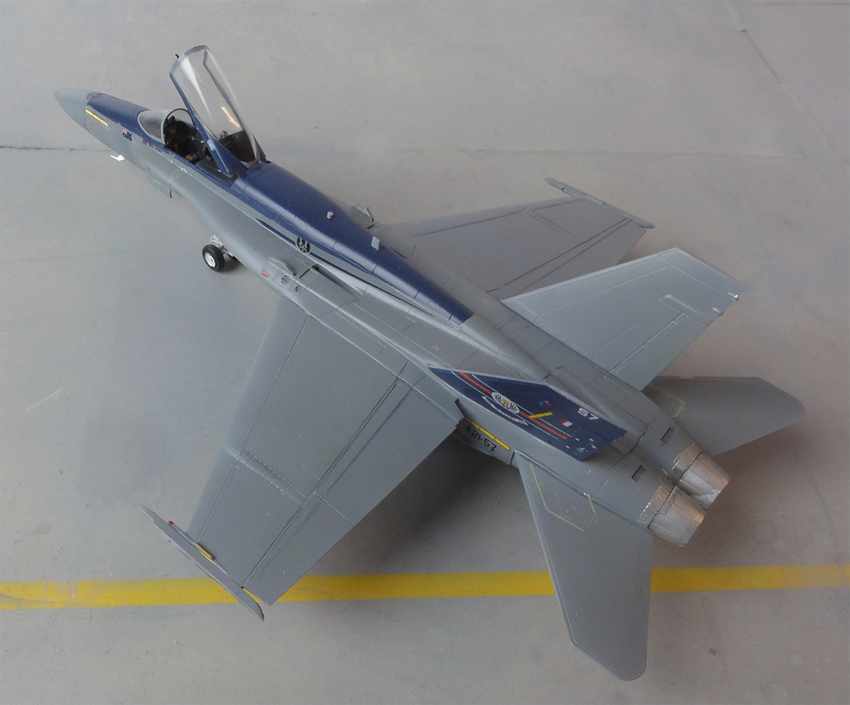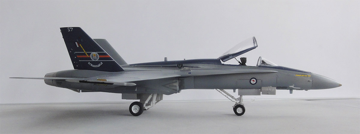 Decalling was done. The kit decals have what appears to be black numbers and stencilling; but when applied they indeed show up as they are very dark grey so OK. ![]() The various white areas on wing, leading edge extensions, cockpit and canopy frames are decals. I used these. ![]() After they had dried 24 hours unfortunately the white decals turned out to be a bit opaque (not 100% covering on the black undersurfaces). It also had to do with air bubbles trapped under a decal despite rubbing the decal. For a better look, I got a large white spare decal sheet and cut white decals to cover the bigger areas; these were set on top of the white kit decals. While they improve how the special scheme looks, I was NOT happy. The lesson learned here is that I should have had made masks and airbrush the white areas. Yes, it is a lot of effort but will give a far better looking model. The landing gear was now to be installed. RAAF F-18 obviously did not need the US NAVY carrier nose launch tie bar and that was not fitted. First jets flew without. But later on another type of shimmy damper was installed that look like the nose catapult tie bar. On this upgraded A21-18 the new type shimmy damper bar is clearly seen on the box top photo so the nose strut kit part #C7 was simply used. -![]() The main gear doors got retraction rods made from thin white plastic stretched sprue bits. In the front nose gear bay, a metal actuator was made from scrap and the gear doors also got retraction rods. The remainder of the parts were installed including the missing 2 pitots. Also a few antennas were made of thinner plastic card. See notes above like about the anti-collision lights painted. The canopy was first set closed and again, the white decals for the frames did not fit very well and a bit translucent.... I was not happy and should have known.... After a few days I removed the canopy again, cleaned up and set the canopy after some repainting and detaling open. Inside canopy frames 3 mirrors were made from scrap and small other bits. ![]() The jet was kept clean with no pylons and no weaponry. Finally this special jet than got a few coats of gloss varnish airbrushed with thinned Johnson Future/ Pledge. ![]() Royal Australian Air Force (RAAF) F/A-18A coded A21-18 of no. 75 squadron in a black-white livery as it would retire in 1991. ![]() ... set in a scenery at Williamtown air base, Australia... MORE Hornet models to follow! Keep watching this modelling report |