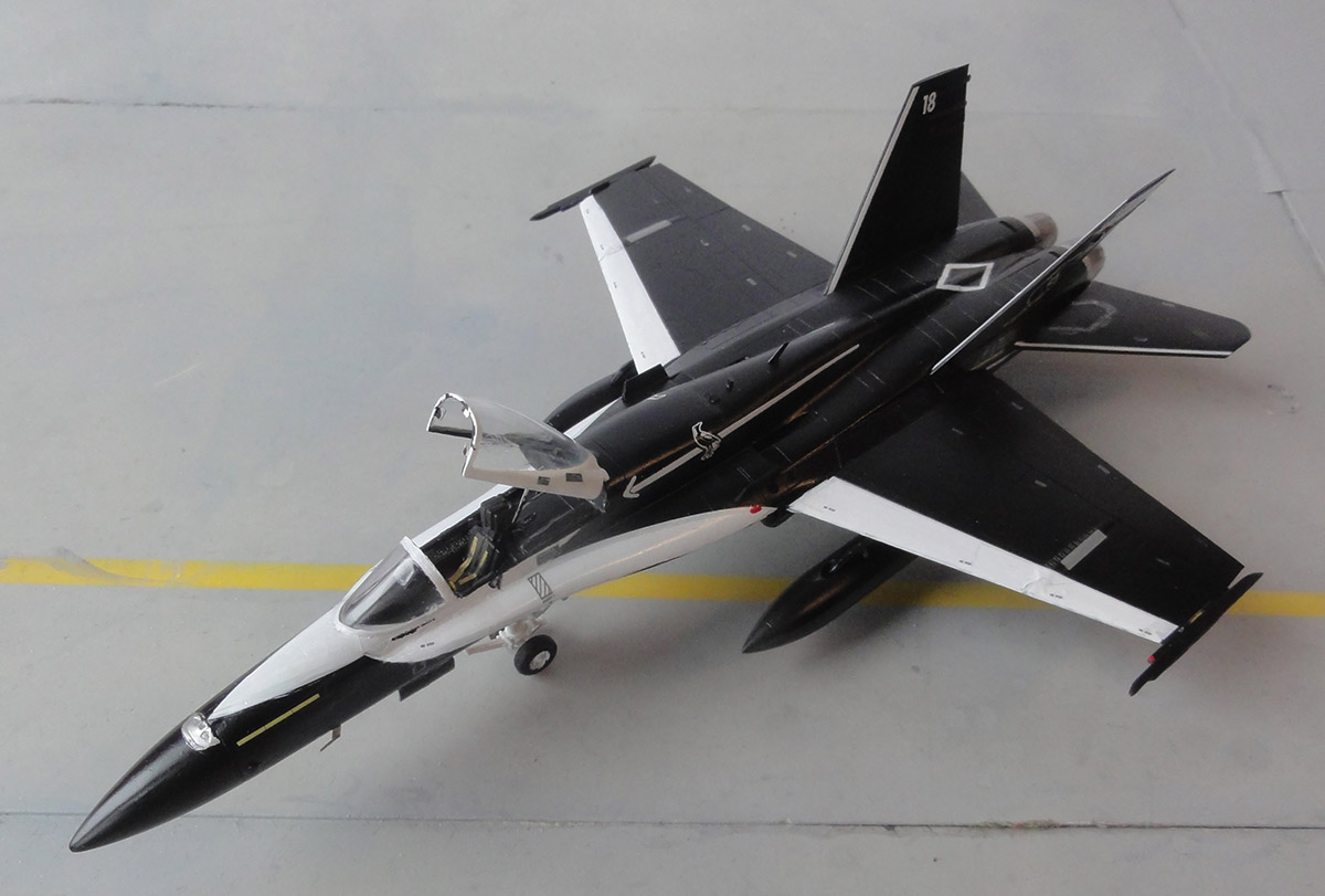 Another 1/72 Hasegawa F/A-18A kit was made, also in a special RAAF scheme. ![]() Kit #02411 has special markings for a Royal Australian Air Force (RAAF) F/A-18A coded A21-18 of no. 75 squadron in a black-white livery as it would retire in 1991. It is the only decals scheme provided in this kit release. The aircraft had obviously received the various updates during its career. ![]() The white areas are also provided as decals, more about that later on. ![]() The kit was almost made as described on earlier made Hasegawa kit. ![]() An overall gloss black coat was airbrushed with thinned Gunze Sangyo Mr.Hobby H2 Black acrylic. Also on some parts like gear doors still in their sprues and the external fuel tanks. ![]()