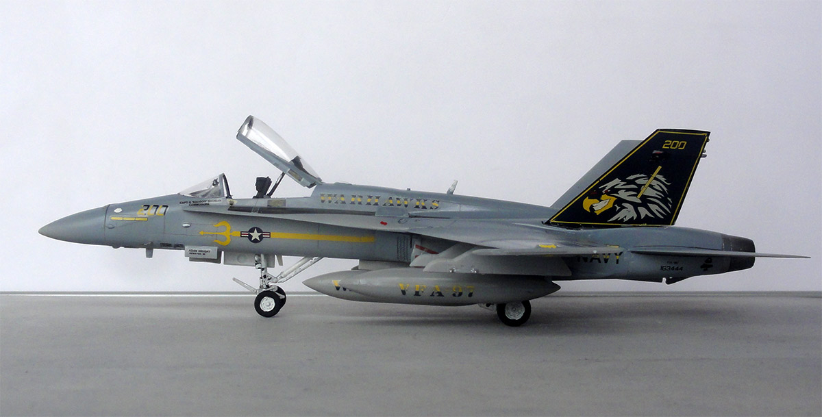 Another extra added was a metal fret for the front canopy frame with mirrors from a etched EXTRATECH detail set I still had. On photos I could not see clearly any IFF "bird slices" in front of the windshield so these were not added. ![]() Another nice model of F/A-18C is now in the US NAVY collection flown by WARHAWKS VFA-97. ![]() ![]() ![]() ![]() |