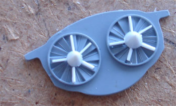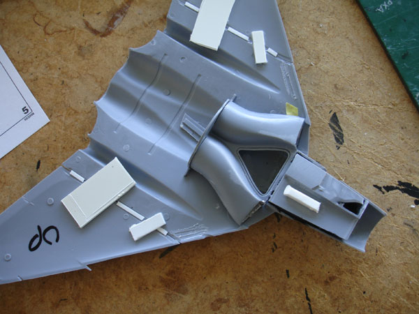 STEP 4 The exhaust assembly is a bit trickly because parts are easily damaged, so take care here. The resin parts can be fitted as is, no need to removed there mould backings. STEP 5 The intakes do not fit too bad, but the compressor blades fronts are incorrect. Nothing will be seen through the intakes, but I inscribed more fan blades on part #C5 and added a bigger cone for the nose cut from two old bombs. The intakes look to be metal coloured. Importantly and visible. the intake guide vanes are missing! So these should be added later on from EVERGREEN plastic strip iniside both intakes. The main wheel door wells on the FAW.1 have a straight forward edge as compared to the FAW2. So, only some sanding of the bay edge and swopping the doors is needed or use the relevant doors also presented on the FAW2 sprues as well. The main gear bays fit OK but are bare. The nose bay roof needs some reduction in thickness to avoid fit problems later on. The standard FAW1 supplied as well tailbooms are OK, but do NOT fit them yet! STEP 6 The outboard wings are separate in the kit, you could make them up folded, but there are no hinge mechanisms for the hinges, only plain ribs.