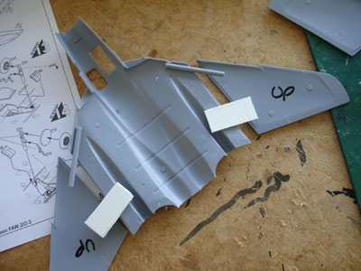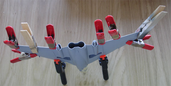 The upper fuselage and upper outboard wings were now joined and I made sure the sections were joint OK both in chord profile and in spanwise. This was set to dry 4 hours.