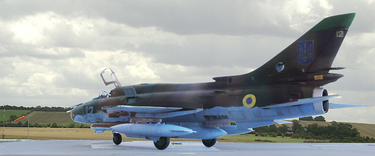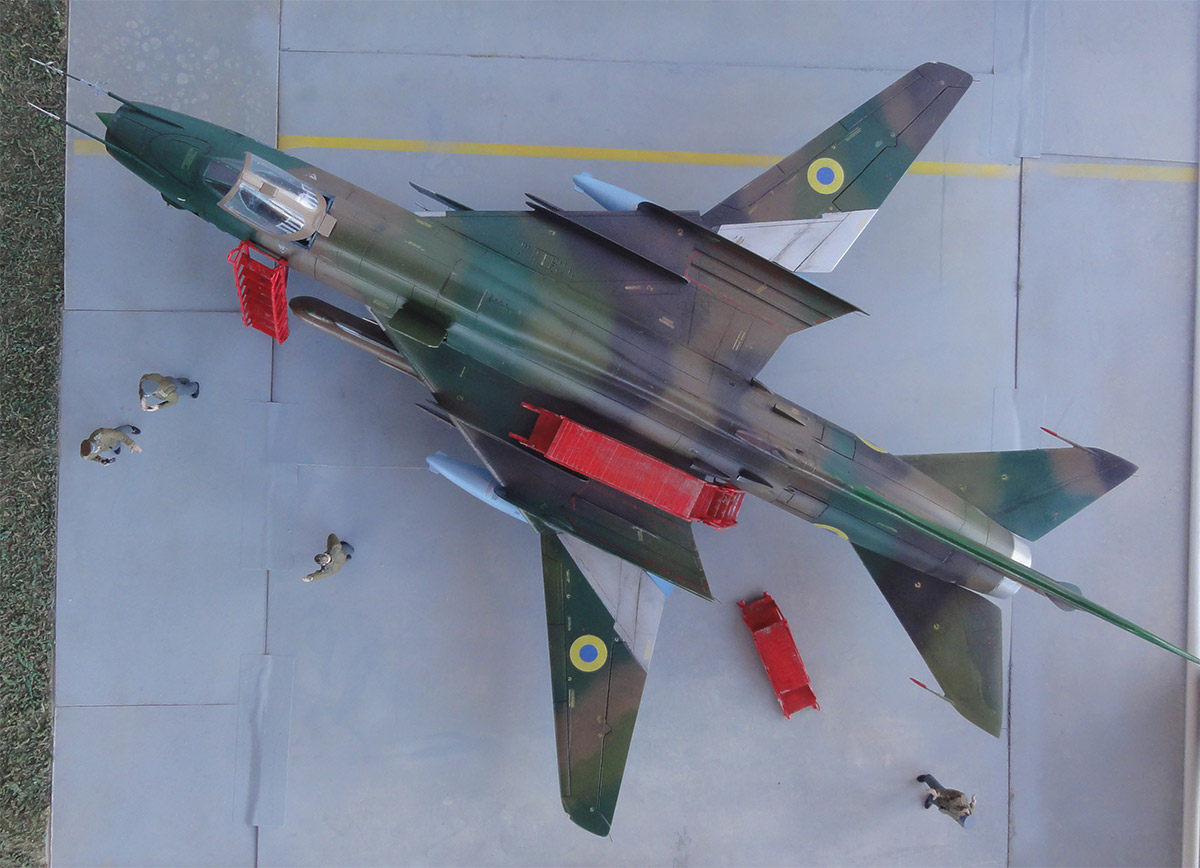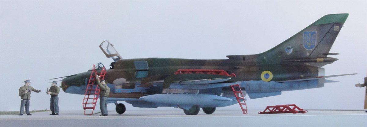 ... set in a scenery of airfield, Ukraine... For a simple diorama some ladders and platforms were scratch made from plastic rod and sheet. Looking at photos, some typically used items were made as seen on base SU-17 platform maintenance. ![]() A 1/32 scale crew was made and painted from Profimodeller set 32344. The diorama was kept simple and is not permanent as I have no room in the hobby display cabinets. Only set for display at local model shows. ![]() A unique 1/32 model of the SU-17 M4 UKRAINE is now in the collection. | |